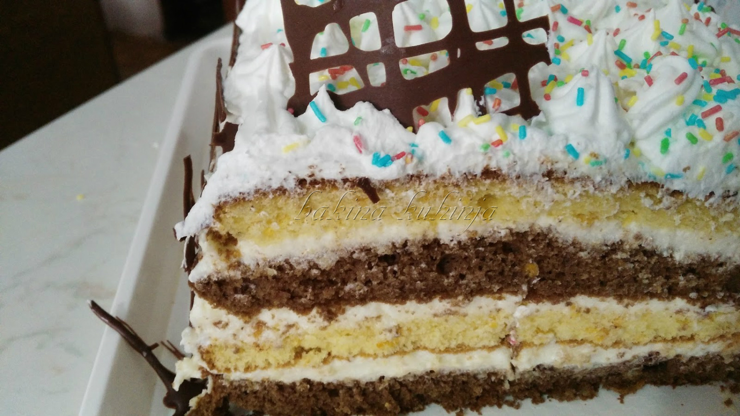 Potrebnio je za dve korice: Za žuti biskvit 3 jaja 150 gr. šećera korica pomorandže i limuna 200 gr brašna 1/2 peciva 100 ml. mleka 100 ml. ulja Tamni deo: 3 jaja 150 gr. šećera korica pomorandže i limuna 200 gr brašna 1/2 peciva 100 ml. mleka 100 ml. ulja 2 kašike kakao praha Krema 1/2 l. mleka 2 vanile 120 gr. gustina 250 gr šećera 250 gr. margarina