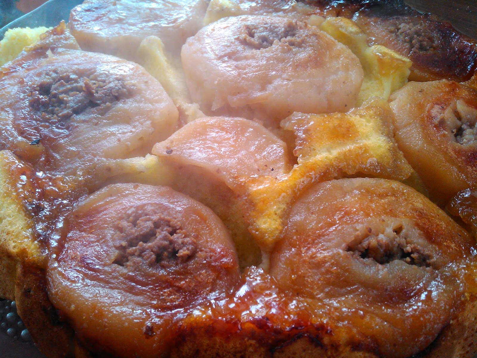Jabuke oljuštiti, izdubiti i u svakou jabuku napuniti mešavinom mlevenih oraha, meda i 3 kašike šećera. Šerpa veličine oko 30 sm.Preko jabuka staviti 10 kašika šećera , cimet i margarin isečen na listiće. Peći dok se jabuke ispeku Jabuke ne smeju da budu premekane, samo do pola da budu mekane. Umutiti patišpanj od jaja dodati ulje, mleko i na kraju brašno pomešano sa praškom za pecivo. Preliti preko jabuka i sve zajeno peći na 170 stepeni dok se piškota ne ispeče. Pečeno da se ohladi u šerpi, pa hladno izvrnuti na tacnu. Umutiti 250gr šlaga sa 3dcl mleka i premazati preko. Ja sam malo ukrasila sa rendanom čokoladom, vi možete po želji…