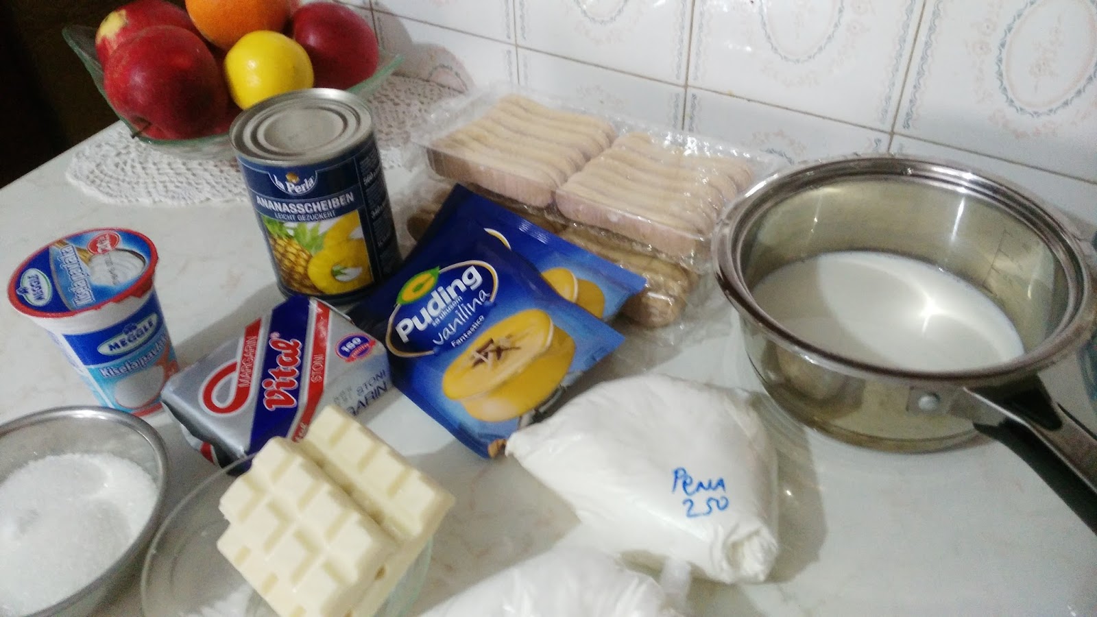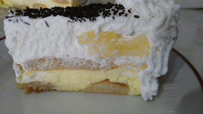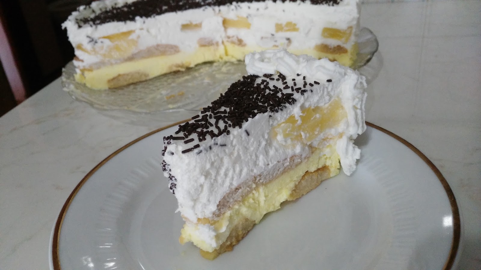Obruč za pečenje torte staviti na poslužavnik pa u njega poredjati prvo pakovanje piškota koje ste umočili u sok od ananasa.Njih premazati žutim kremom. Zatim drugo pakovanje piškota. Na njih
