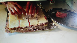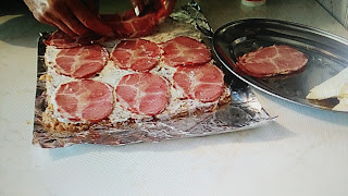 Razvući pravougaonik na foliju koju malo pouljite , ne mnogo tanko, namažete malo pavlakom pa poredjate suhomesnato i odozgo kačkavalj i urolujete.