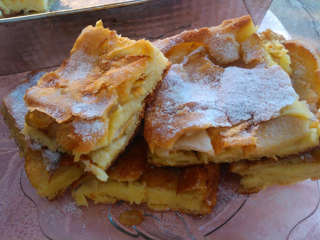 Dodati ostatak mleka. Masa mora biti gušća nego za palačinke. Pleh dobro pouljiti i ugrejati u rerni da bude dobro vruć pa u ugrejan pleh sipati smesu. Kruške iseći na tanke kriške i poredjati po testu. Peći na 200 stepeni C 30-35 min da dobro porumeni.